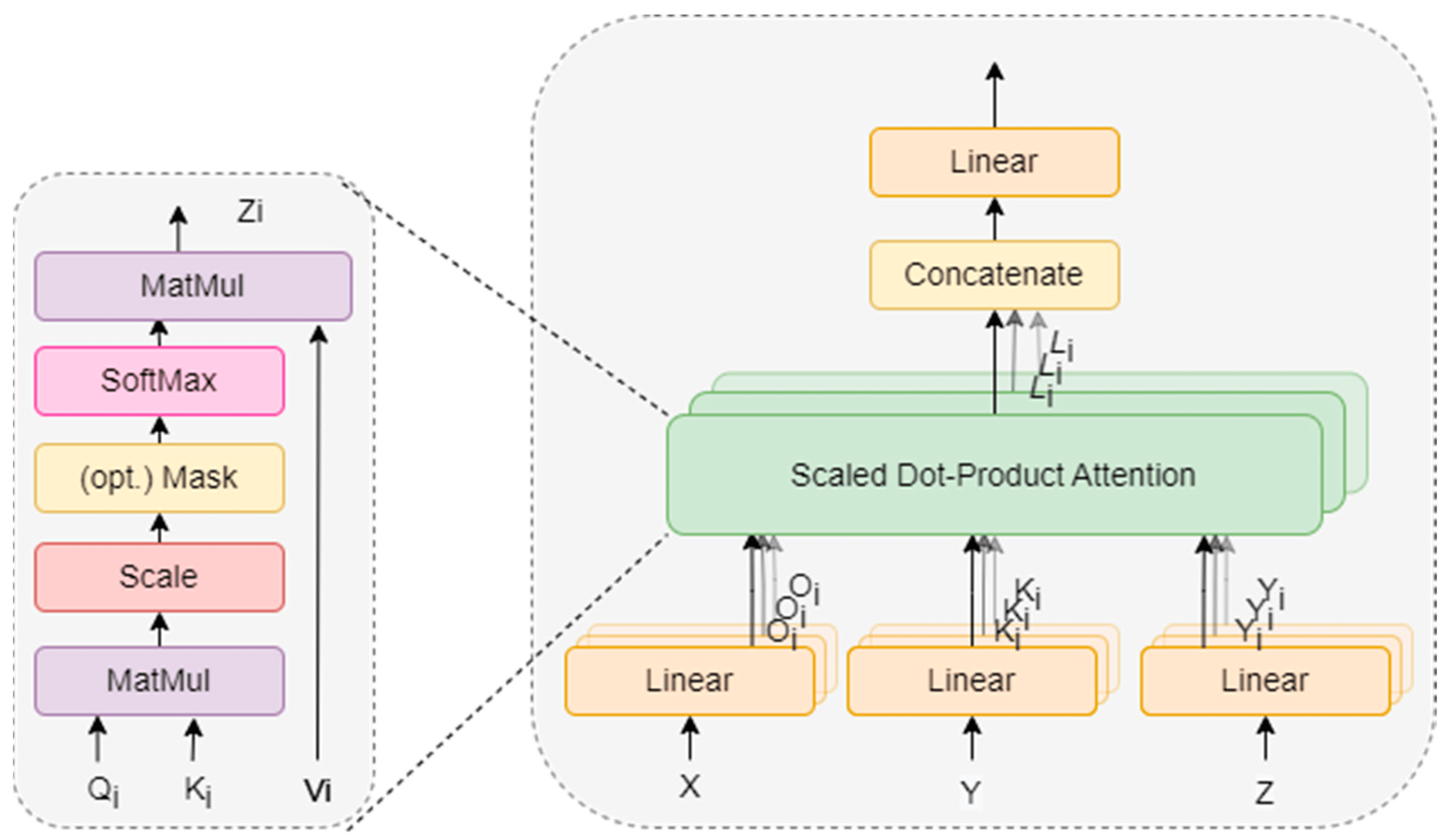 \[ Attention(Q,K,V) = (\frac{Q . K^T}{\sqrt(d_k)}) . V \] \[ MultiHeadAttn(Q,K,V) = (head_1,...,head_H)W^O \] \[ where \] \[ head_i = Attention(QW^Q_i,KW^K_i,VW^V_i) \]
