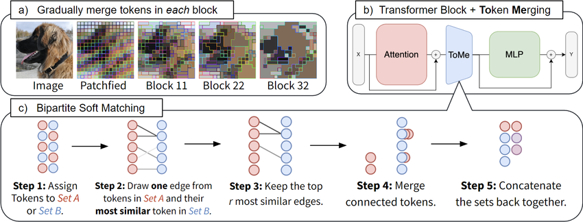Paper looks at improving throughput of ViT models without retraining, by gradually combining similar tokens using a fast and lightweight matching algorithm. Evaluated on ImageNet-1K and Kinetics-400 datasets.